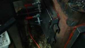 Posted: December 19, 2011 Filed under: Arduino, Homemade Boiler, LCD display, Testing | Tags: Arduino, Arduino boiler control, homeade chip boiler, homemade chip boiler, lcd display, LCD problems, welding Leave a commentA friend and excellent engineer visited over the weekend and between us we decided to improve the burner a little. The first change we decided to make was to add some insulation. I measured the temperature around the outside of the boiler with a non contact thermometer at approx. 350°F in the area of the firebox. The mounting plate that holds the burner was approaching that temperature as well. The air box was lower but still this is an excessive temperature. The Auger pipe was solid from the hopper to the burner unit and since I have both 4″ pipe and 4″ tube we decided to make a thermal break in the auger feed for additional safety. The 4″ pipe even though it is surrounded by the air box eventually gets warm and since the feed auger has a fair amount of room between the auger and the pipe there is a certain amount of fuel that remains in the pipe and at shut down this can smolder. So to remove this problem and make the unit more safe a redesign was initiated. Adding insulation between the air chamber and the burner with the addition of a thermal break prompted us to take the unit apart, check it over and see how everything was faring as well as make improvements. But of course after the burner and hopper were cut apart and on the bench more improvements were noted. Most of the improvements now fall into minor design for manufacturing type areas, maybe a little less welding and a little more tabbed nut and bolt assembly so minor changes can be made more quickly. Of course being able to pull the auger feed away from the burner assembly without unbolting anything will be a big change and improvement. I am going to make the air box bolt on as well. Should be reassembled for another test on Wednesday.