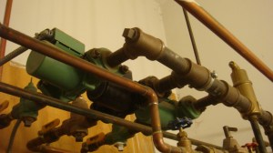 Posted: October 25, 2011 Filed under: Plumbing the boiler | Tags: Arduino, chip, circulator pump, pellet, welding 1 CommentToday my plan is to size the circulator pump from the chip boiler through the manifolds of the existing oil-fired boiler. The formula is: Q = h/(Cp*p*Delta T) Where Q is the heat transfer in Gallons per minute, Cp is the specific heat capacity, a constant based on the fluid, in this case water, p (really rho, I need help figuring out how to add greek letters and subscripts) and an assumed temperature drop or Delta T. Since it is my intention to run the chip boiler at 180°F and set the min temp on the oil burner at 130°F this will give me a 50°F temperature before the temp of the furnace requires it to fire. By leaving myself enough room I am hoping the Arduino controller and good temperature monitoring will preclude the oil boiler from firing. For the formula however I am going to assume a temperature difference of 20°F. So, again assuming a 30,ooo Btu chip boiler, a Cp for water of 1 BTU/Lbm/1°F, p (rho) the density of water, 62.34 lb/cu ft., Delta T=20°F and to convert BTU to gal/min 7.48 Gal/cu ft Therefore Q=30,000(7.48 gal/cu ft)/((1 Btu/lbm/1°F)(62.34 lb H2O/cu ft)(60 min/hr)(20°F)=2.9997 GPM